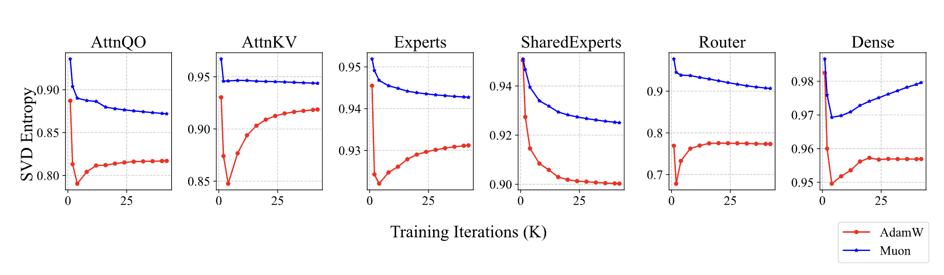 Of course, the above analysis is general and not limited to the Q and K projections. In fact, in the Moonlight experiments, we observed that models trained with Muon tend to exhibit higher singular value entropy across weight matrices—supporting the hypothesis that Muon promotes higher-rank updates. What makes the attention logits particularly sensitive is their bilinear form, \(q_i \cdot k_j = (x_i W_q) \cdot (x_j W_k)\), where both \(W_q\) and \(W_k\) participate in a coupled multiplication. This coupling significantly amplifies the risk of spectral norm explosion. Once singular values begin to grow in either projection matrix, their combined effect in the bilinear term can trigger a vicious cycle, where logits become increasingly unstable—eventually leading to MaxLogit explosion.