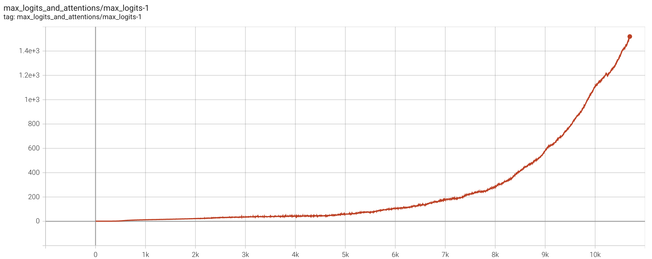 The max is also taken across the batch, producing a scalar. MaxLogit explosion refers to \(S_{\max}\) steadily increasing during training—with linear or superlinear growth—and remaining unstable for long periods.