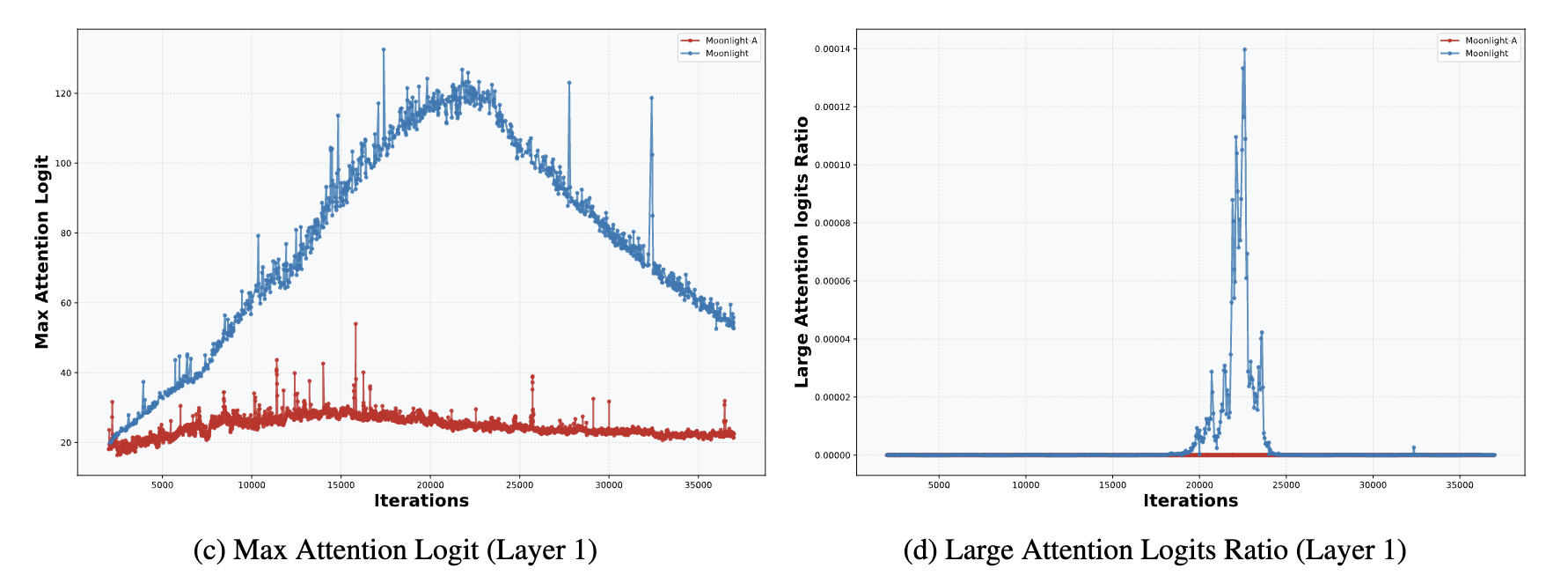 Note: Saying that “Muon is generally more prone to MaxLogit explosion than Adam” does not imply that MaxLogit explosion occurs only with Muon. In fact, DeepSeek-V3, which was trained using Adam, also exhibits MaxLogit explosion, as seen in its open-source release. Similarly, Gemma 2, which applies a soft cap to prevent MaxLogit explosion, was also trained with Adam. Therefore, while we emphasize the importance of QK-Clip in stabilizing Muon-based training, it can also be effectively combined with Adam—resulting in a variant we refer to as AdamClip, for users who prefer to stick with the Adam optimizer.